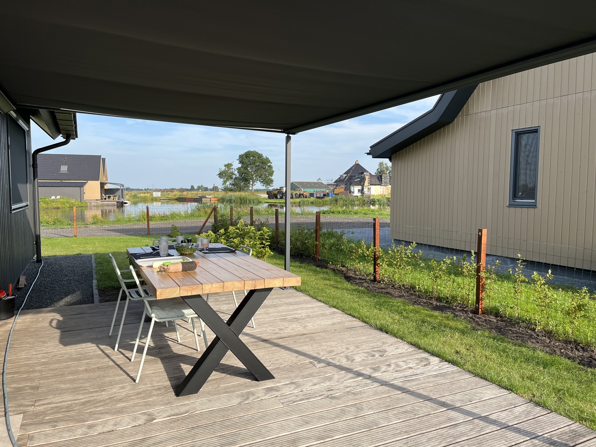Rondom het huis is een prachtige en stijlvolle tuin aangelegd. Een hardhouten vlonderterras verhoogt het vakantiegevoel. De zijkanten zijn begrensd met een harde afscheiding, de straatzijde is af te sluiten met een flexibel hek. Voor kinderen wordt een zwemvest aangeraden bij spelen in de tuin want er is directe toegang tot water. Met meerdere zitplekken is er altijd luwte, schaduw, wind of zon te vinden. Tuinslang met sproeier aanwezig.