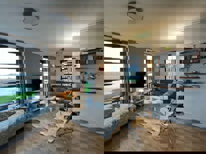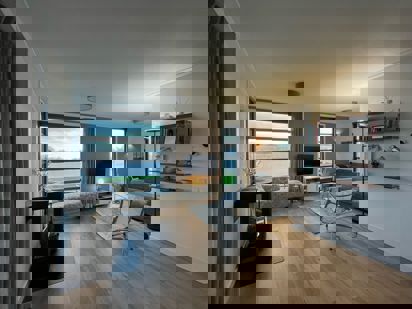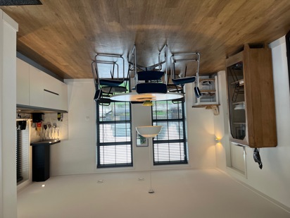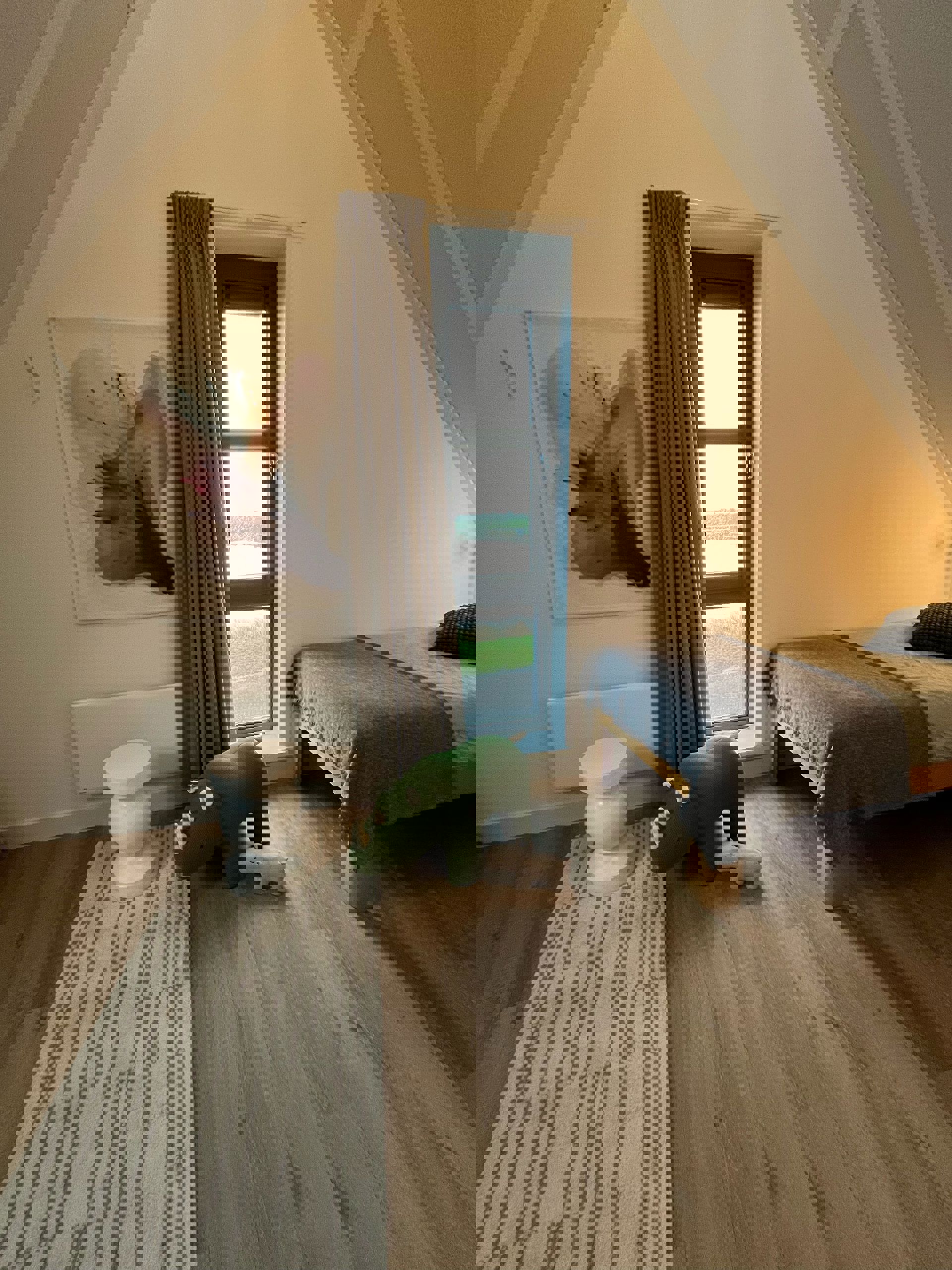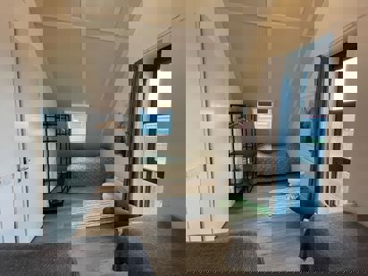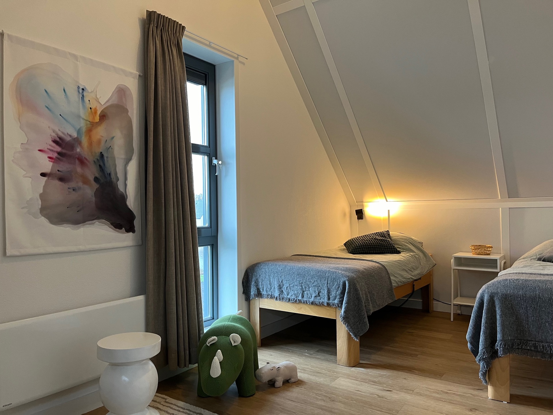 Hier vind je twee losse eenpersoonsbedden ( met electrisch bediend hoofd en voeteneinde) en twee extra éénpersoonsbedden (een onderschuifbed). Dit biedt de mogelijkheid om twee personen extra te verwelkomen. Een praktische kast biedt voldoende opbergruimte voor kleding en persoonlijke spullen, waardoor de slaapkamer opgeruimd en georganiseerd blijft.