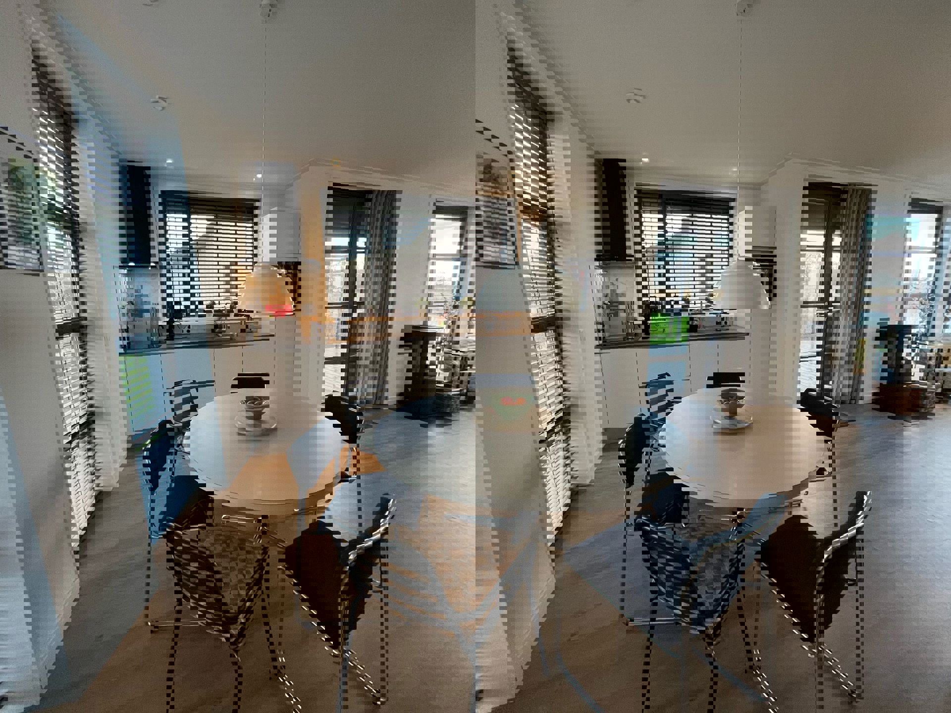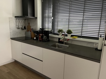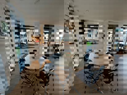 De eetkamer en keuken is volledig uitgerust met moderne apparatuur, waaronder een ruime koelkast, inductie-kookplaat, oven, magnetron en vaatwasser. Het aanrechtblad biedt voldoende ruimte voor bereiding, terwijl de aangrenzende berging zorgt voor een opgeruimde en georganiseerde omgeving.